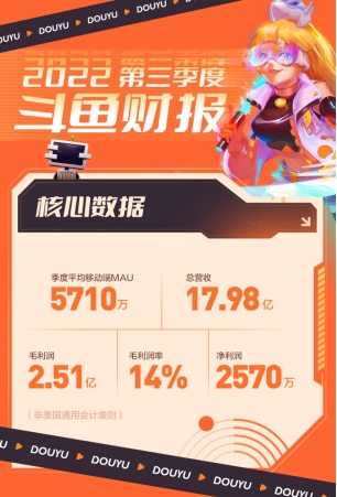 财报显示,斗鱼第三季度总营收为17.98亿元。毛利润为2.51亿元,对应毛利率14.0%。非美国通用会计准则下,斗鱼净利润2570万元,同比环比均显著提升。斗鱼移动端季度平均MAU为5710万,用户规模保持稳定。