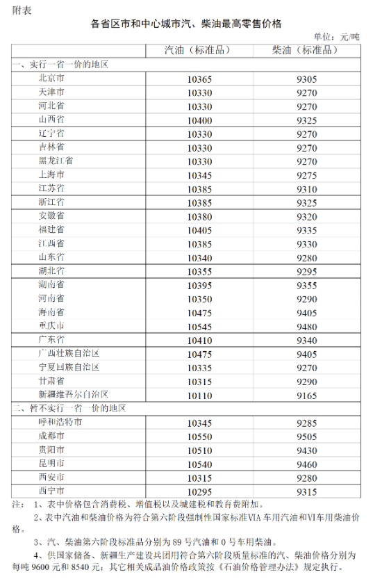 智通财经APP获悉,据发改委11月21日消息,根据近期国际市场油价变化情况,按照现行成品油价格形成机制,自2022年11月21日24时起,国内汽、柴油价格(标准品)每吨分别降低175元和165元。调整后,各省(区、市)和中心城市汽、柴油最高零售价格见附表。相关价格联动及补贴政策按现行规定执行。