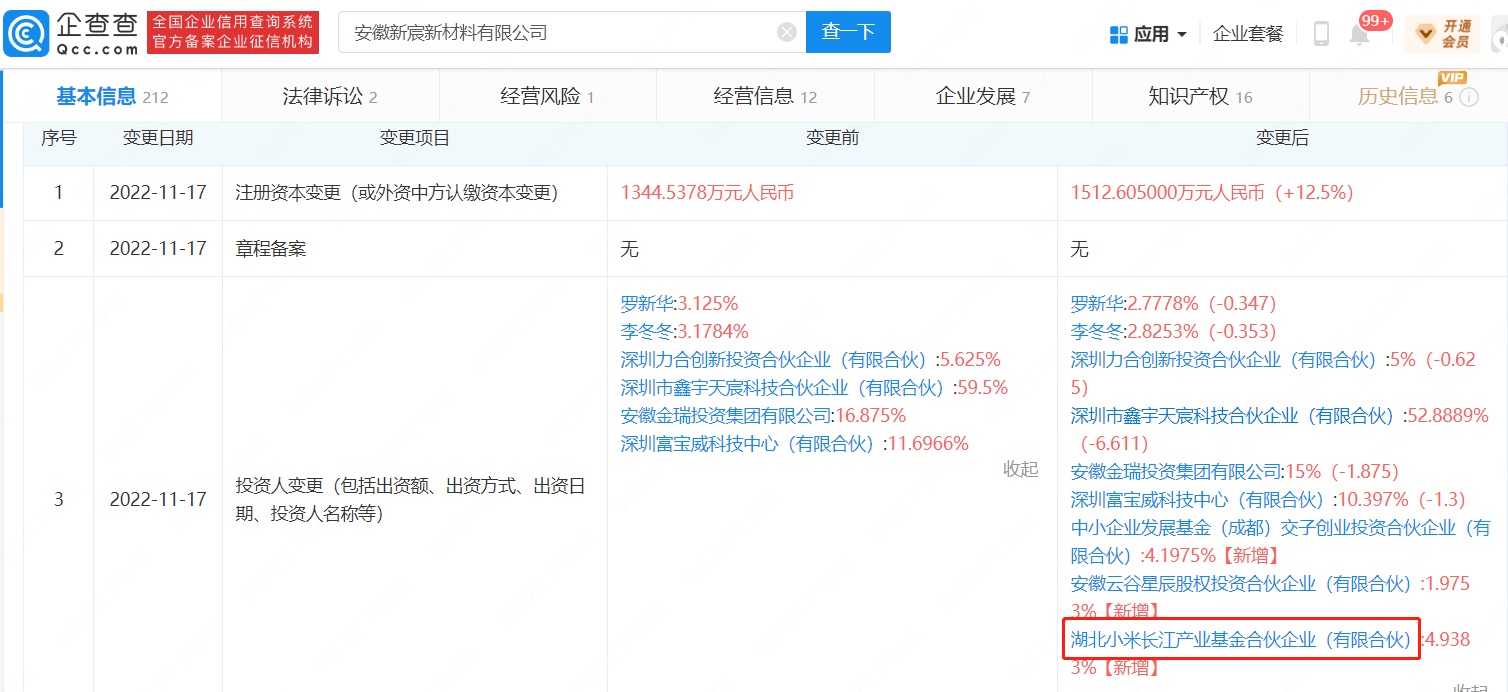 智通财经APP获悉,企查查APP显示,近日,安徽新宸新材料有限公司(下称:新宸新材料)发生工商变更,新增湖北小米长江产业基金合伙企业(有限合伙)为股东,同时公司注册资本由1344.54万元人民币增加至1512.61万元人民币,增幅12.5%。据公开资料显示,新宸新材料成立于2021年12月,是一家电池电解液用电解质锂盐生产商,主要生成电解质锂盐LiFSI,服务于新能源电动汽车领域。