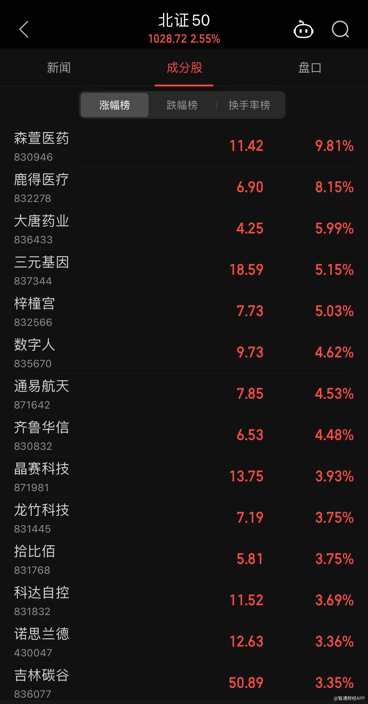 智通财经APP获悉,11月21日,北交所首个指数——北证50成份指数正式发布实时行情。据悉,前5大权重股分别为吉林碳谷(836077.BJ)、连城数控(835368.BJ)、贝特瑞(835185.BJ)、颖泰生物(833819.BJ)、诺思兰德(430047.BJ)。截至收盘,北证50指数上线首日涨2.55%,报1028.72点。成分股一片飘红,吉林碳谷、诺思兰德均涨超3%。同日,华夏基金上报华夏北证50成份指数证券投资基金。国泰君安证券称,随着未来指数基金产品的入市,将进一步完善北交所产品体系建设,有利于丰富投资者的数量与结构,为市场带来更多长期资金,提升市场流动性水平。以专精特新为主的北交所市场迎来投资机会,北证50样本股有望率先受益。