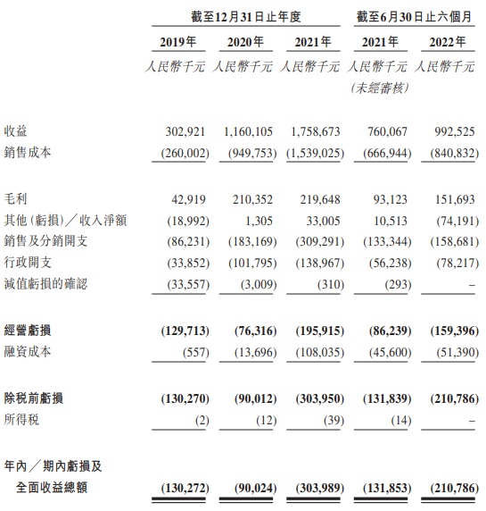 财务方面,于2019年度、2020年度、2021年度以及2021年、2022年截至6月30日止六个月公司收入分别约为人民币3.03亿元、11.6亿元、17.59亿元、7.6亿元、9.93亿元。其中,公司的毛利分别约为0.43亿元、2.1亿元、2.2亿元、0.93亿元、1.52亿元,此外,公司录得经营亏损1.3亿元、0.76亿元、1.96亿元、0.86亿元、1.59亿元。