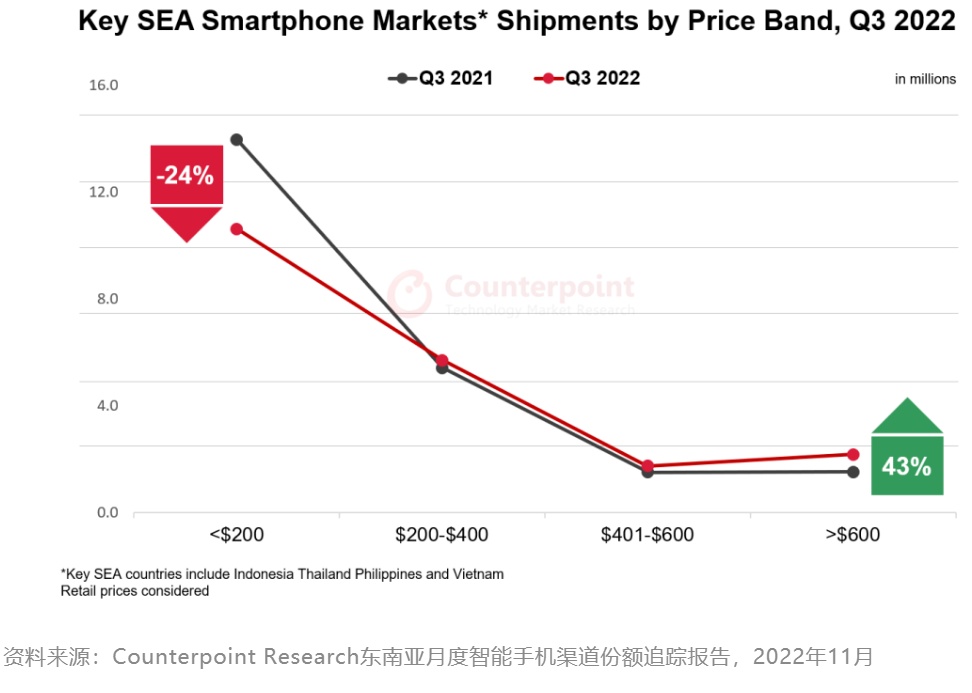 智通财经APP获悉,11月22日,根据Counterpoint Research东南亚月度智能手机渠道份额追踪报告,东南亚主要市场的高端智能手机(售价超过400美元,约合人民币2800元)出货量于2022年第三季度年同比增长29%。但另一方面,本季度智能手机总出货量年同比下降了10%。面对宏观经济困境,东南亚的商业和消费情绪低迷,投资放缓,且部分国家的外商直接投资乏力,共同导致智能手机品牌厂商在2022年第四季度前出现库存过剩。然而,在困难时期高端智能手机出货量仍实现年同比大增,凸显出这个细分市场消费者的消费力韧性。