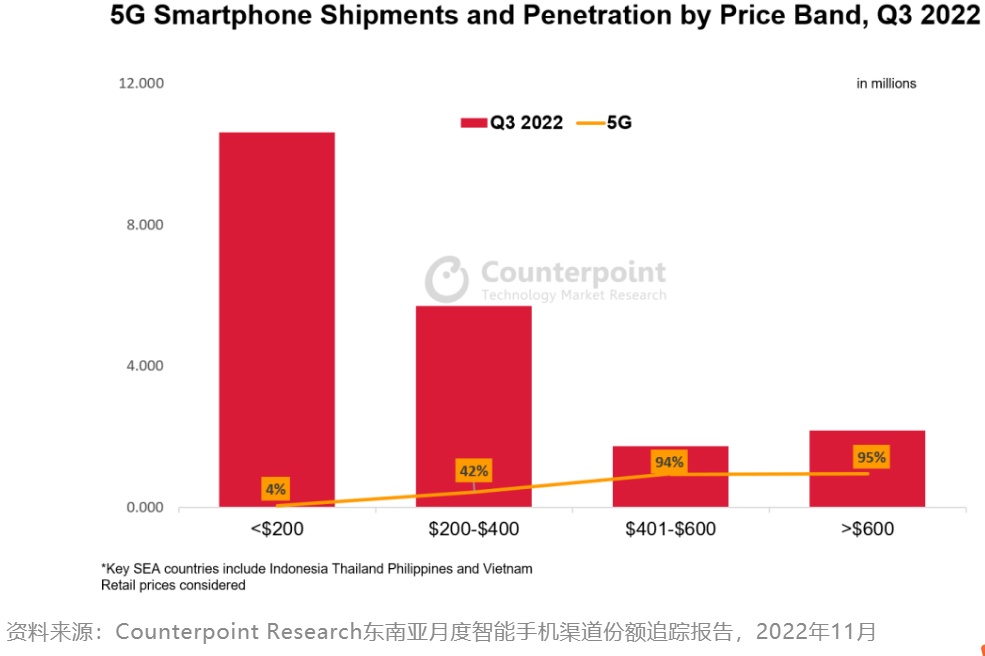 菲律宾的Globe等营运商积极地将5G基础设施的兴建从市区向外扩展,而在印度尼西亚,采矿等行业已开始采用5G技术。200-400美元的5G智能手机同比增长73%,表明多数OEM正将5G作为一个主要卖点。