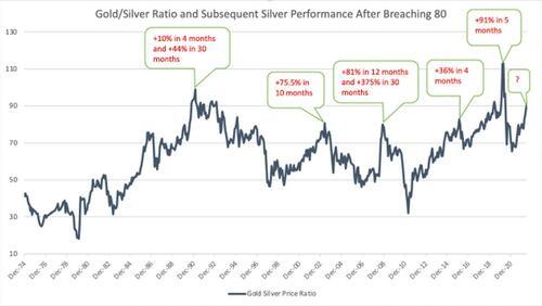 历史数据表明,当金银价差如此之大时,白银的表现不仅优于黄金,而且会在短时间内大幅上涨。自2000年1月以来,这种情况已经发生了四次。