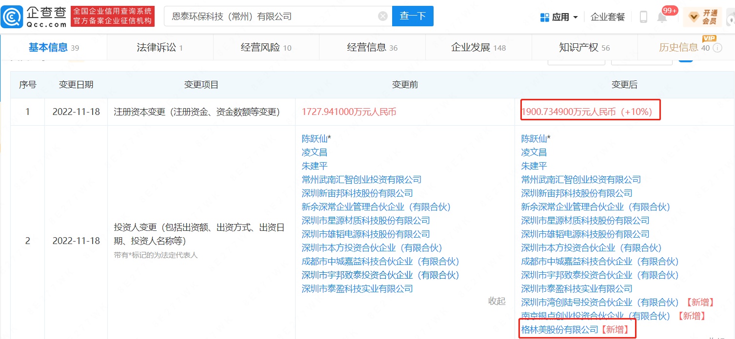 智通财经APP获悉,企查查APP显示,近日,恩泰环保科技(常州)有限公司(下称:恩泰环保)发生工商变更,注册资本由1727万元增至1900万元,新增格林美(002340.SZ)为股东。据公开资料显示,恩泰环保成立于2016年11月,主要从事高性能水处理膜的设计、研发、生产、销售及服务,节能环保工程,资源综合和循环利用工程,水处理工程设计、管理和承包等专业项目。
