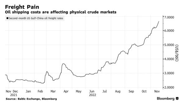 智通财经APP注意到,不断飙升的运输成本给现货石油市场带来了更大的压力。现货石油市场已经受到俄罗斯原油价格上限的不确定性和中国购买量疲弱的打击。周一,该行业基准贸易航线的日收益突破10万美元,为2020年初以来的最高水平,当时新冠疫情导致油轮储存货物激增。随着对俄罗斯的制裁迫使船只走更远的航线,石油公司和贸易商不得不支付越来越高的运费。这增加了原油的成本。
