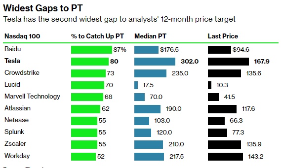 智通财经APP了解到,特斯拉(TSLA.US)股价近期持续下跌,让一直看多该股的华尔街分析师给出的目标价显得可望不可即。这个巨大的差距意味着特斯拉的股价需要大幅上涨80%才能达到分析师目标价中值。今年以来,这家由埃隆•马斯克领导的公司股价下跌达52%,截至昨日收盘价为167.87美元,而分析师给出的12个月目标价中值为302美元。