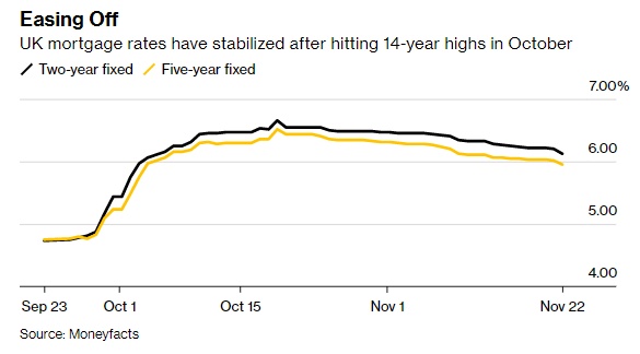 据Moneyfacts Group Plc的数据,英国平均五年期固定利率抵押贷款周二降至5.95%。这是自10月5日关键抵押贷款利率飙升至14年高点以来,该利率首次跌破这一门槛。两年期固定利率债券的平均利率也降至6.13%,为10月6日以来的最低水平。