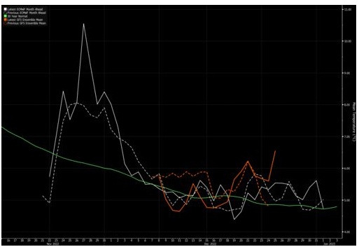 根据天气预报公司Maxar Technologies LLC的一份报告称,本周一股寒流袭击了英国,气温低于正常水平。周二伦敦的最低气温将低至3摄氏度,这将推高天然气和电力需求,下周气温将再次上升。