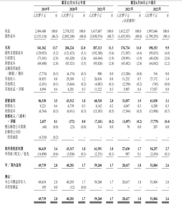 财务方面,2019年、2020年、2021年及2022年前6月,公司收益分别是24.94亿元、23.78亿元、34.18亿元及19.98亿元人民币;同期,净利润分别是6973.9万元、4028.1万元、5926万元及5180.4万元人民币。
