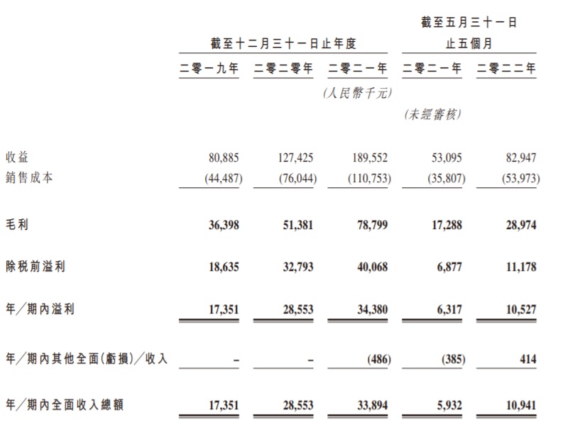 财务方面,公司纯利由2019年的人民币1735.1万元增加至2021年的人民币3438万元,复合年增长率为40.8%,公司纯利由截至2021年5月31日止五个月的人民币631.7万元进一步增加66.6%至2022年同期的人民币1052.7万元。收益方面,公司于2019年、2020年、2021年及2022年5月31日止5个月收益分别约为8088.5万元、1.27亿元、1.90亿元、8294.7万元。