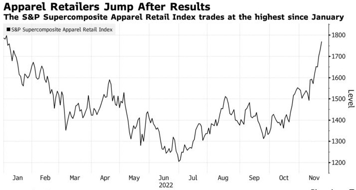 标普超级综合服装零售指数周二上涨2.2%,领涨的是爱芬奇和美鹰服饰。该指数连续第三天上涨,近几个交易日在年初以来的高位附近交投,此前上周有大量零售巨头财报出炉。