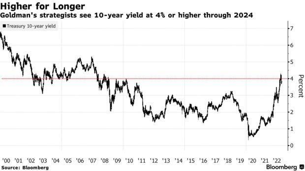 智通财经APP获悉,高盛表示,随着美联储在对抗通胀的过程中避免了经济收缩,至少到2024年底,基准10年期美债收益率将保持在4%或更高的水平。高盛首席利率策略师Praveen