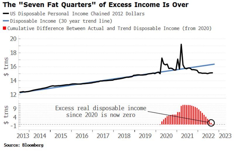 根据30年趋势线,超额可支配收入又回到了平稳状态,这表明超额收入不再支持超额储蓄,因为人们的支出增加了,而政府停止了与疫情相关的转移支付。