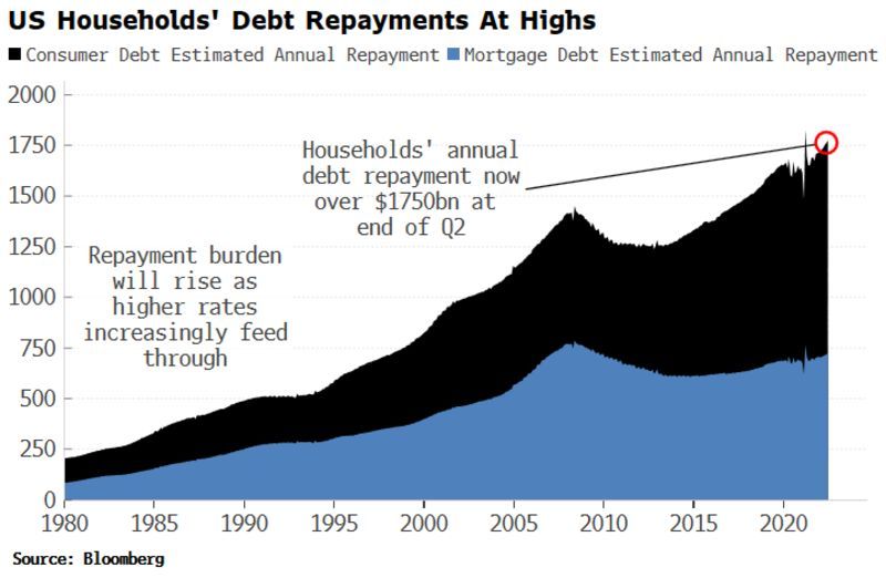 不断增加的债务偿还对储蓄造成了越来越大的压力。CPI和抵押贷款利率都在上升。偿债率(债务偿还占可支配收入的百分比)仍然相对较低,不过也在上升。随着债务调整为更高的利率,偿债率可能会快速上升。