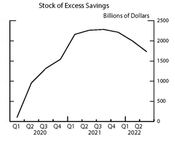 美联储估计,超额储蓄已减少至1.7万亿美元(截至2022年中),一年内下降26%。随着利率上升的滞后效应产生影响,超额储蓄量可能会以更快的速度下降。