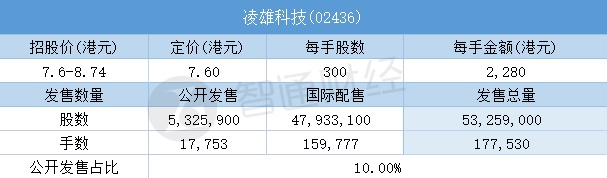 智通财经APP获悉,11月23日,凌雄科技(02436)配售结束。配售招股价7.60-8.74港元,最终定价7.60港元,每手2280港元。