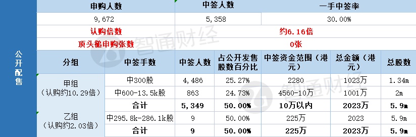 其中,公开配售申购人数9672人,一手中签率30.00%,认购倍数约6.16倍。