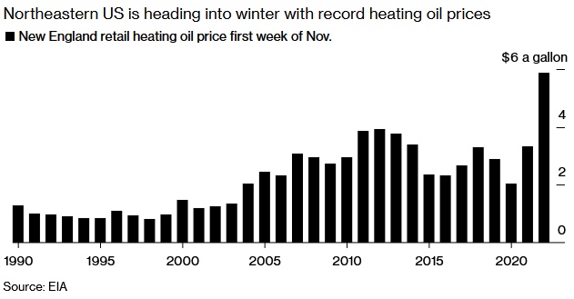 美国东北部是人口最密集的地区,在严寒的冬季里气温常常低于零度,因此该地区也是家庭取暖最依赖取暖油的地区(柴油和取暖油在美国是同一种产品,只是税率不同)。即使在最好的情况下,今年冬季该地区的消费者也将承受数十年来最高的能源账单。美国政府目前预计,依赖取暖油的家庭将比去年冬天多支付45%的费用,远高于10月份预期的27%。