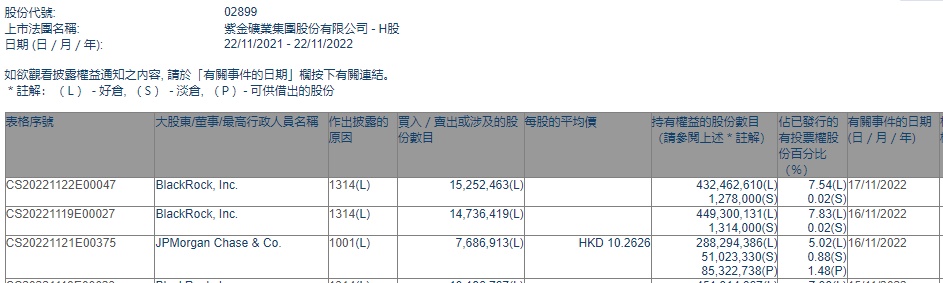 智通财经APP获悉,联交所最新资料显示,11月16日,摩根大通增持紫金矿业(02899)768.6913万股,每股作价10.2626港元,总金额约为7888.77万港元。增持后最新持股数目约为2.88亿股,最新持股比例为5.02%。