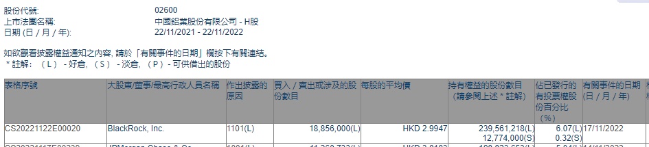 智通财经APP获悉,香港联交所最新资料显示,11月17日,贝莱德增持中国铝业(02600)1885.6万股,每股作价2.9947港元,总金额约为5646.81万港元。增持后最新持股数目约为2.40亿股,最新持股比例为6.07%。