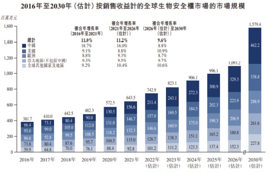 在招股书中,益世科生物提到其所处的广义上的全球生命科学、制药及生物加工工具市场规模按销售收益计量,已由2016年的1000亿美元增加至2021年的1626亿美元,并预计在2030年达到3214亿美元。