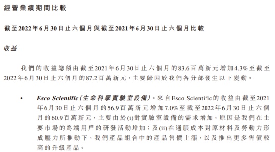 益世科生物亦是如此。疫情推动力下降在2022年上半年业绩中体现明显。与上年同期相比,益世科生物今年上半年收入仅增长了4.3%,而核心收入来源的生命科学实验室设备(以生物安全柜为主)的业务收入增长为7%,较上年同期的8.8%出现下滑。