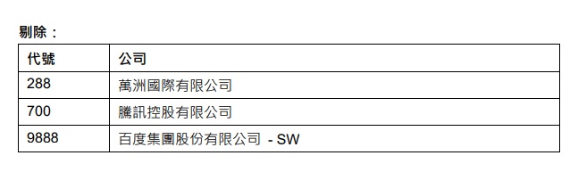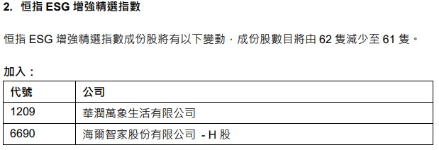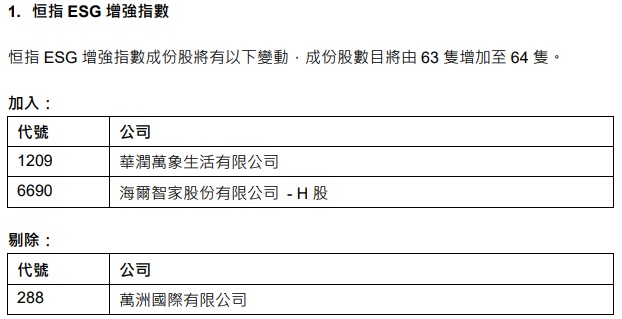恒指 ESG 增强精选指数成份股数目将由 62 只减少至 61 只,加入华润万象生活、海尔智家,剔除万洲国际、腾讯控股(00700)等。