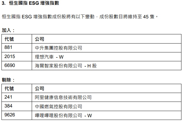 恒生国指 ESG 增强指数成份股数目将维持至 45 只,加入中升控股(00881)、理想汽车(02015)、海尔智家,剔除阿里健康(00241等。