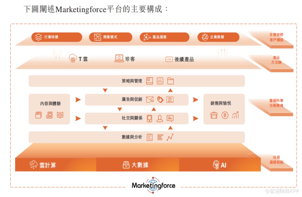 公司的Marketingforce平台涵盖170个功能模块,可解决企业在营销和销售阶段的各类痛点。公司基于特定客群的共同痛点及普遍特性,设计及构建SaaS产品,例如T云和珍客。公司还为广告客户提供精准营销服务,协助其增加在目标受众中的线上曝光。