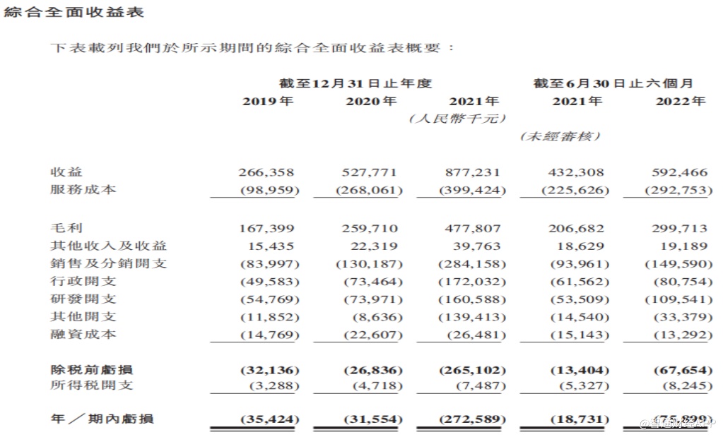 随着业务规模扩大,迈富时的收入呈快速增长态势。2019年、2020年、2021年及截2022年前六个月,公司的收入分别约为2.66亿元、5.28亿元、8.77亿元及5.92亿元。遗憾的是,收入实现快速增长的同时,公司自2019年以来长期处于亏损状态。上述期间,公司期内亏损分别约为3542.4万元、3155.4万元、2.73亿元及7589.9万元,累计亏损金额达到4.16亿元。