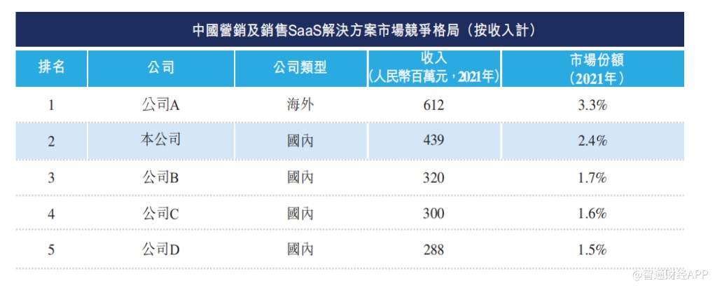 迈富时招股书显示,据弗若斯特沙利文的资料,按2021年收入计,公司是国内最大的营销及销售SaaS解决方案提供商,亦是在中国提供营销及销售SaaS解决方案的厂商中的第二大厂商,市场占有率达2.4%。