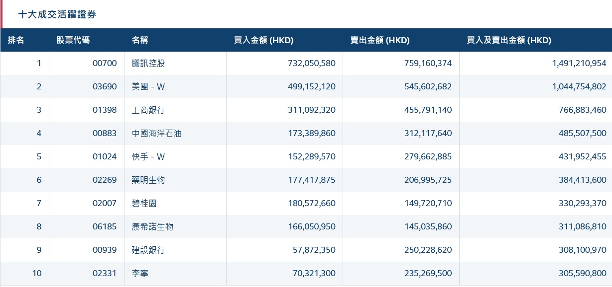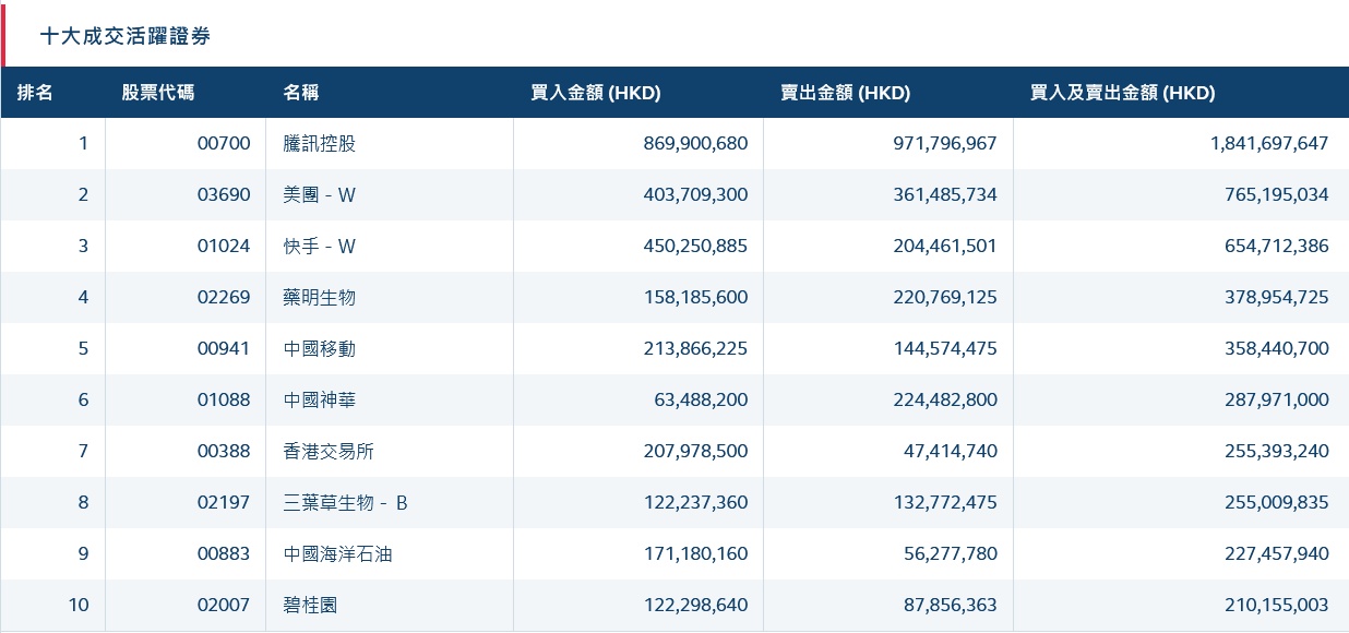 此外,中国移动(00941)获净买入6929万港元。而腾讯(00700)、中国神华(01088)分别遭净卖出1.29亿、1.6亿港元。