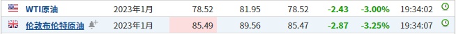 3. 截至发稿,WTI原油跌3.00%,报78.52美元/桶。布伦特原油跌3.25%,报85.15美元/桶。