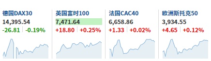 2. 截至发稿,德国DAX指数跌0.19%,英国富时100指数涨0.25%,法国CAC40指数涨0.02%,欧洲斯托克50指数涨0.12%。
