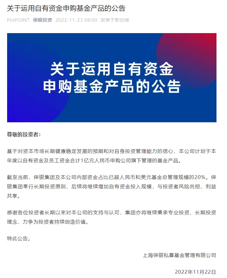 保银投资在公告中透露,截至当前,保银集团及本公司内部资金占比已超人民币和美元基金总管理规模的20%。保银集团奉行长期投资原则,后续将继续增加自有资金投入规模,与投资者风险共担、利益共享。