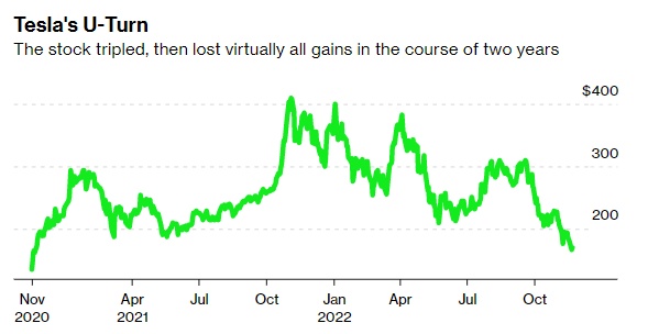 然而,最近不少他的支持者开始抱怨,并对该公司股价自那以来的“180度大转弯”(U-turn)表达出极度不满。特斯拉(TSLA.US)股价曾在两年内增长了两倍多,但如今这些收益几乎全被抹去。与此同时,马斯克对推特的收购迄今看来是一桩时运不济的交易,为了收购推特马斯克频繁抛售特斯拉股票,使得一些特斯拉投资者丧失信心,引起股价暴跌,而这一收购也给马斯克个人的财富造成了重大损失。