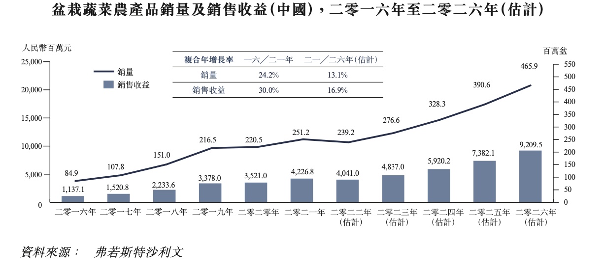 不过据弗若斯特沙利文预计,随着疫情限制逐步放开,餐厅经营也将于2023年起恢复正常,盆栽蔬菜的销售预期也将重回上升轨道。预计盆栽蔬菜农产品的销量或将以13.1%的复合增长率增长,到2026年将达到4.65亿盆,在销售收益方面,其将于2026年增至92.09亿元,复合年增长率为16.9%,即将形成一个百亿规模的市场。