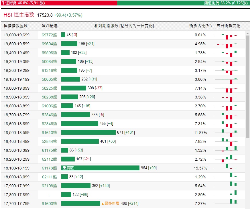 法兴恒指牛熊证街货分布图中的数据显示,熊证街货重货区在18100-18199区间,该区间最新熊证数量为964张,较上一交易日增加99张;最多新增在17700-17799区间,该区间最新熊证数量为480张,较上一交易日增加214张。