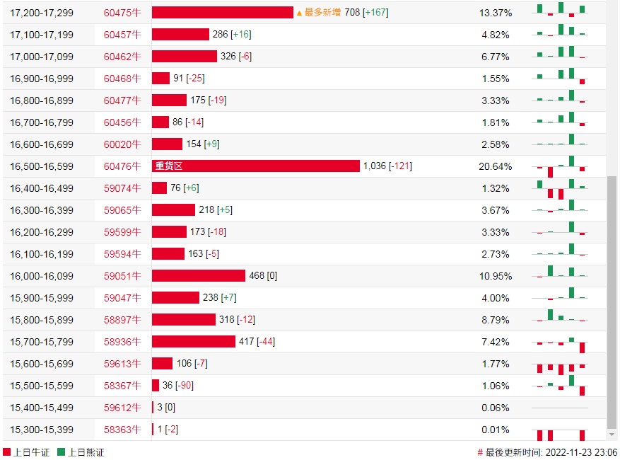 牛证街货重货区和最多新增都在16500-16599区间,该区间最新熊证数量为1036张,较上一交易日减少121张;最多新增在17200-17299区间,该区间最新牛证数量为708张,较上一交易日增加167张。