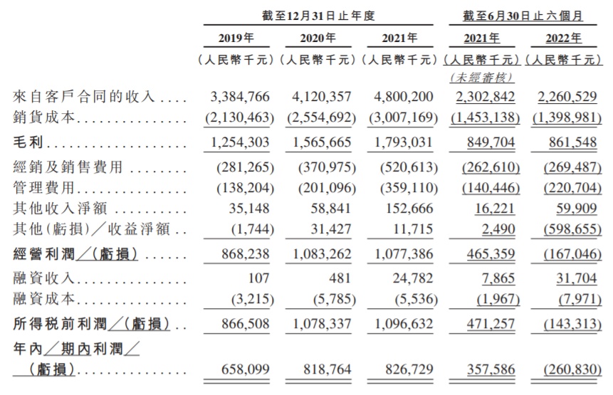 总体财务数据方面,公司于2019年、2020年、2021年及2022年截至6月30日止六个月分别录得收入人民币约33.85亿、41.2亿、48亿元和22.61亿元,2019年、2020年、2021年截至12月31日止年度分别录得年内利润约6.58亿、8.19亿、8.27亿元,而2022年截至6月30日止六个月则亏损2.61亿元。