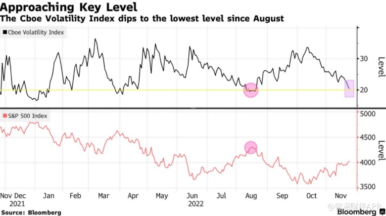 VIX指数上一次收于更低点位是在8月18日,当时正是美股夏季涨势最猛烈的时候。VIX指数在8月股市反弹期间低于20点的关键关口。
