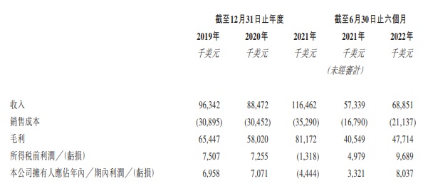 财务方面,于2019年、2020年、2021年12月31日止年度以及截至2021年及2022年6月30日止六个月,公司收入分别为9634.2万美元、8847.2万美元、1.16亿美元、5733.9万美元及6885.1万美元;于2019年、2020年12月31日止年度以及截至2021年及2022年6月30日止六个月,公司拥有人应占年内利润分别为695.8万美元、707.1万美元、332.1万美元及803.7万美元。