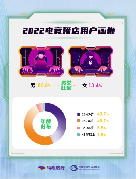 相比商旅酒店,电竞酒店的核心用户更加年轻化,多以90后、95后等“网生一代”为主。《报告》数据显示,近一年内的电竞酒店用户的年龄主要集中在18-34岁,占比为92.4%,其中,18-24岁的人群占比为43.7%。性别分布方面,电竞酒店用户以男性为主,占比达到了86.6%,女性占比仅13.4%。