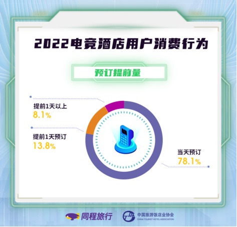 此外,在消费习惯方面,78.1%的电竞酒店用户倾向于在入住当天进行预订,13.8%的用户会提前1天预订,提前1天以上预订的用户占比只有8.1%。在预订时间段方面,电竞酒店用户的下单时间相对集中在周五和周六,当天12点至17点是下单高峰,14点至17点为入住高峰,退房高峰则为12点至15点。
