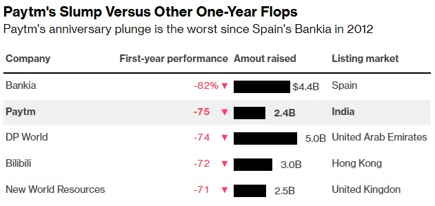 智通财经APP获悉,印度最大数字支付提供商Paytm母公司One 97 Communications Ltd.已创下过去十年来大型IPO中最大的首年股价跌幅,而且这种痛苦还在加剧。该公司创始人将其面临的挑战与特斯拉(TSLA.US)在上市后不久面临的挑战进行了比较,One 97 Communications Ltd.在其24亿美元的IPO一年后,市值蒸发了75%,这是当时印度有记录以来最大的IPO。媒体汇编的数据显示,这是自2012年西班牙Bankia SA股价下跌82%以来,全球IPO企业中首年跌幅最大的一次。