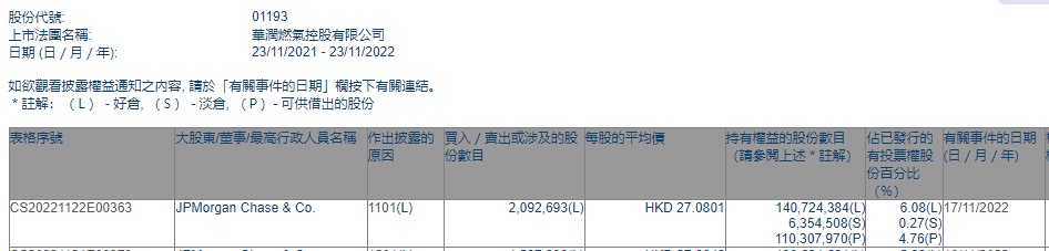 智通财经APP获悉,联交所最新资料显示,11月17日,摩根大通增持华润燃气(01193)209.2693万股,每股作价27.0801港元,总金额约为5667.03万港元。增持后最新持股数目约为1.41亿股,最新持股比例为6.08%。