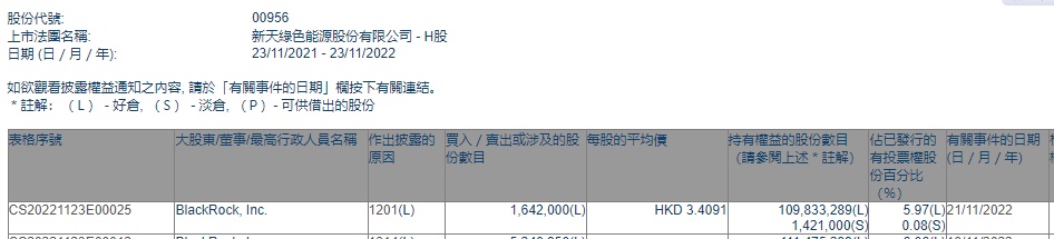 智通财经APP获悉,香港联交所最新资料显示,11月21日,贝莱德减持新天绿色能源(00956)164.2万股,每股作价3.4901港元,总金额约为559.77万港元。减持后最新持股数目约为1.10亿股,最新持股比例为5.97%。