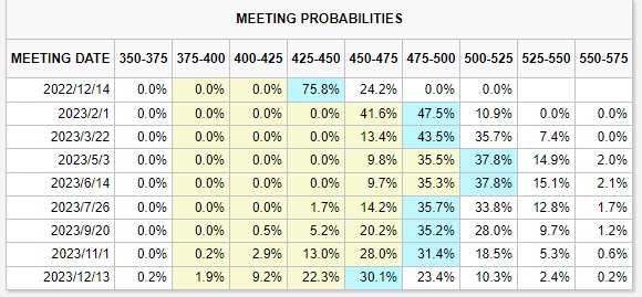 随着通胀飙升,美联储转向了激进的加息——最近四次加息均为75个基点,将联邦基金利率提升至3.75% - 4%的区间。目前,利率期货市场对于本轮加息周期的利率峰值预期区间集中在4.75%—5.25%,美联储在今年12月可能放缓加息步伐,加息50个基点概率接近80%。