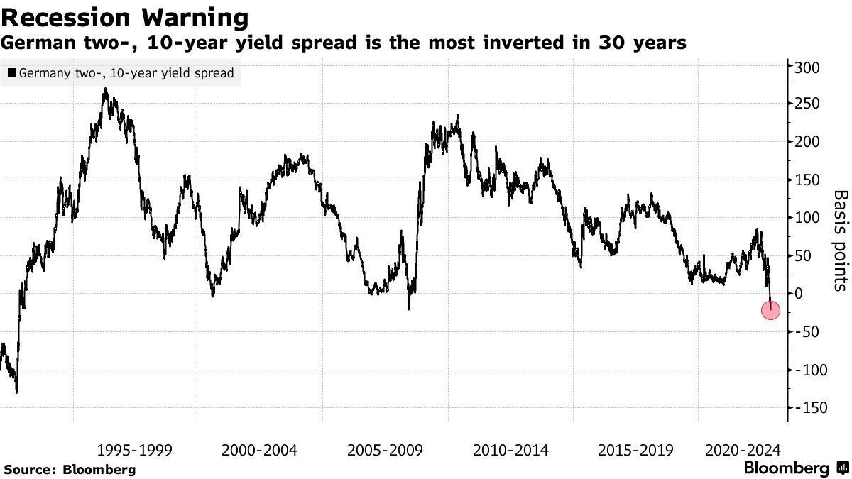 德国2年期/10年期国债收益率倒挂幅度创下30年来之最